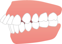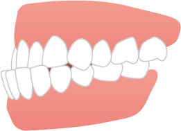 上の前歯が前方に突出している、いわゆる「出っ歯」と呼ばれる状態。口元が出て見えることが多く、発音や咀嚼に影響する場合もあります。具体的には、上の歯列が下の歯列よりも8mm以上前に出ている場合、出っ歯と診断されます。上の前歯が下の前歯よりもかなり前に出た状態で噛み合い、上唇が上がったままの状態になるため、口を正常に閉じることが難しくなります。